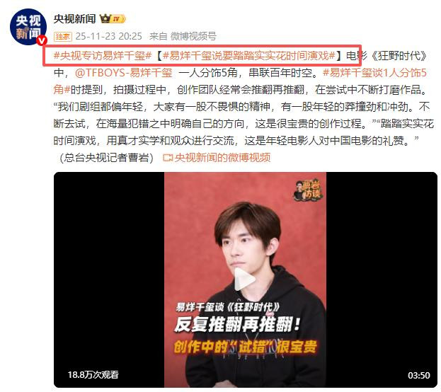 这一天,央视新闻两度专访、央视文娱紧跟点赞,三次点名力赞易烊千玺。