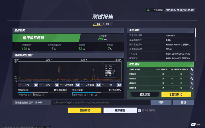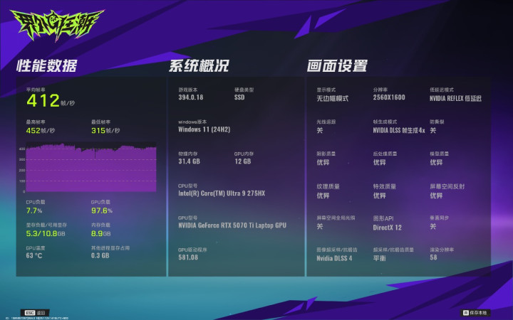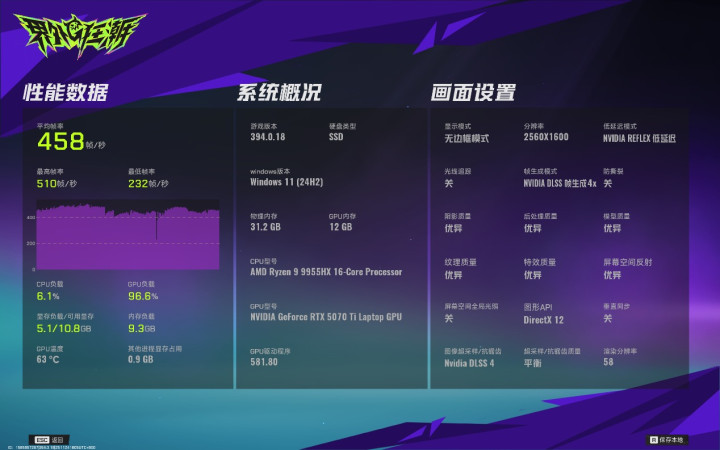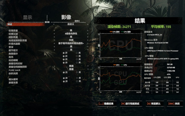 在《古墓丽影:暗影》的内置基准测试中,两台机器都能充分压榨RTX 5070 Ti Laptop的潜力,不过9955HX和275HX的表现还会存在比较直观的差异。在同样开启DX12、DLSS与最高画质的情况下,9955HX跑出了155 FPS的平均成绩,而275HX为145 FPS,锐龙平台高出酷睿平台近7%。