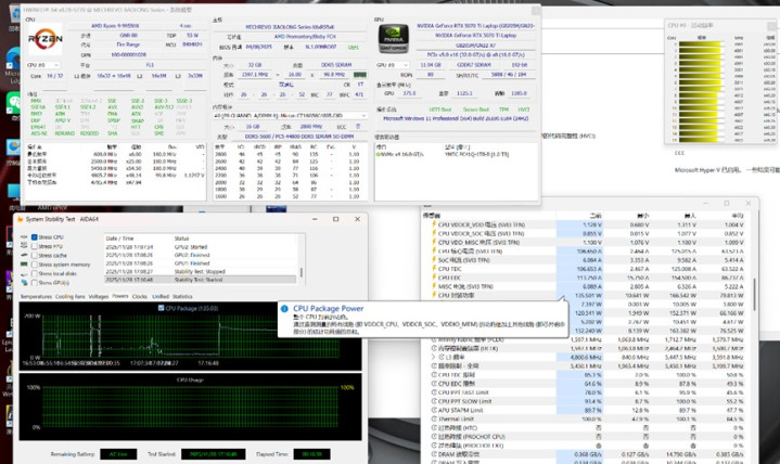 在AIDA64的稳定性压力测试中,两款处理器的峰值功耗都能在短时间内冲上 150W以上。锐龙9 9955HX能够稳定维持在约135W的封装功耗,并在此功耗下将大核频率稳定在5.0GHz左右,未触发过热降频,展现了Zen 5架构在高能耗释放下的优秀温控。