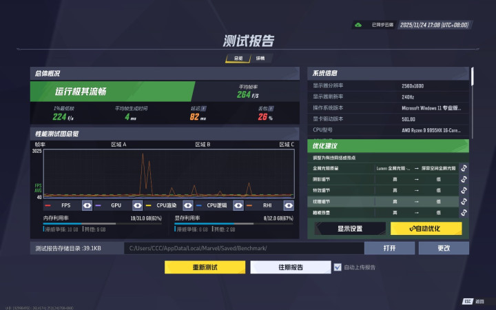 在这类混合型负载场景下,AMD Zen 5架构在多线程调度和能耗释放上的平衡性,使得整体场景帧率更稳定,最终比英特尔略高 10 FPS 左右。而在1%Low帧方面,差距放大。锐龙平台机型1%Low帧达224FPS,酷睿平台有156FPS,相比之下锐龙平台的最低帧高出酷睿平台近44%。