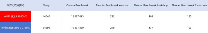 在3D渲染与建模等专业创作场景中,锐龙9 9955HX 的多核效率领先,整体渲染速度对比酷睿 Ultra 9 275HX 平均快21%。对同时兼顾学业与创作需求的大学生、设计专业用户,甚至是追求移动渲染效率的内容创作者而言,是不错的一步到位的解决方案。