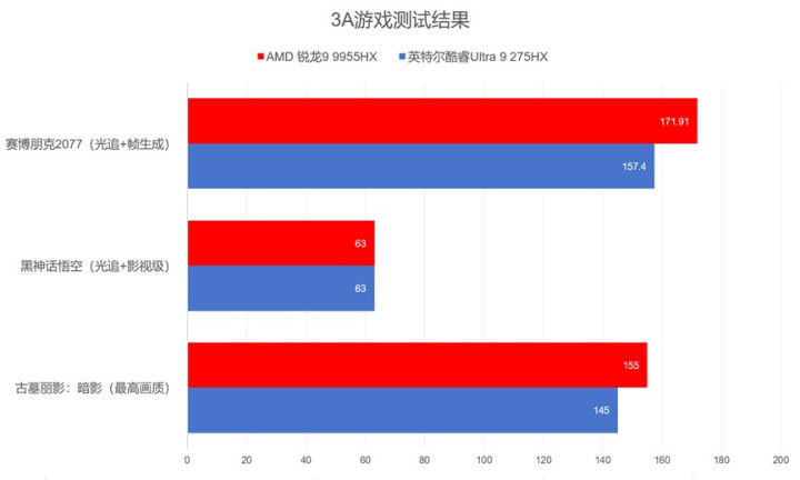 结果显示,锐龙9 9955HX平台跑出171.91 FPS的平均帧率,英特尔酷睿Ultra 9 275HX为157.40 FPS,AMD的领先幅度为9.22%,最低帧领先12.3%。