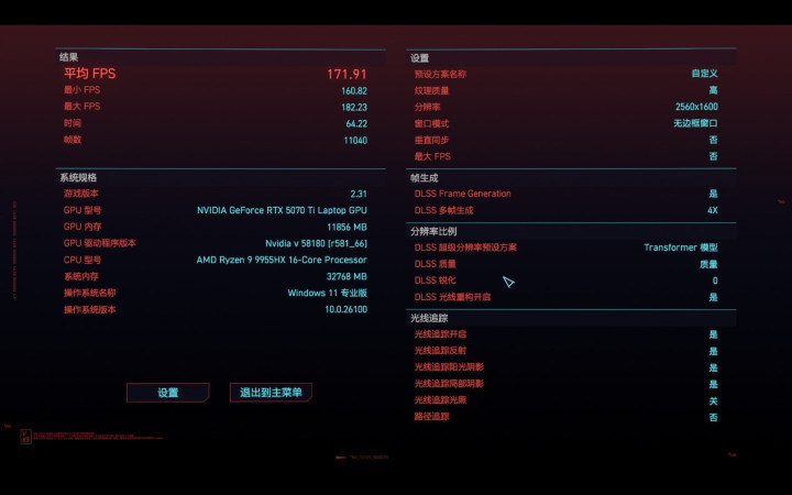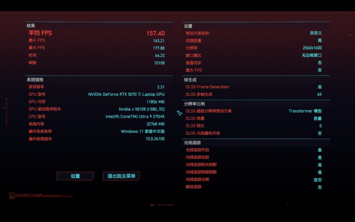 在《赛博朋克2077》中,我们使用2K分辨率、开启帧生成和光追特效的条件下进行了测试。