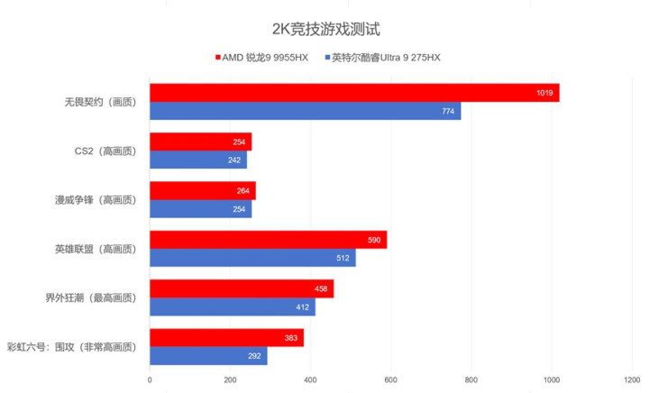 在《界外狂潮》的实测中,在相同配置下,锐龙9 9955HX 的平均帧率为 458 FPS,而英特尔酷睿 Ultra 9 275HX 则为 412 FPS,领先幅度约11%。