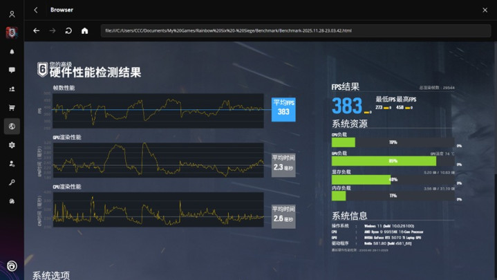 来到《彩虹六号:围攻》,吃帧率、也依赖CPU调度效率,9955HX的优势放大,在相同显卡和统一画质设定下,9955HX交出了383 FPS的平均帧数,而275HX则为292 FPS。