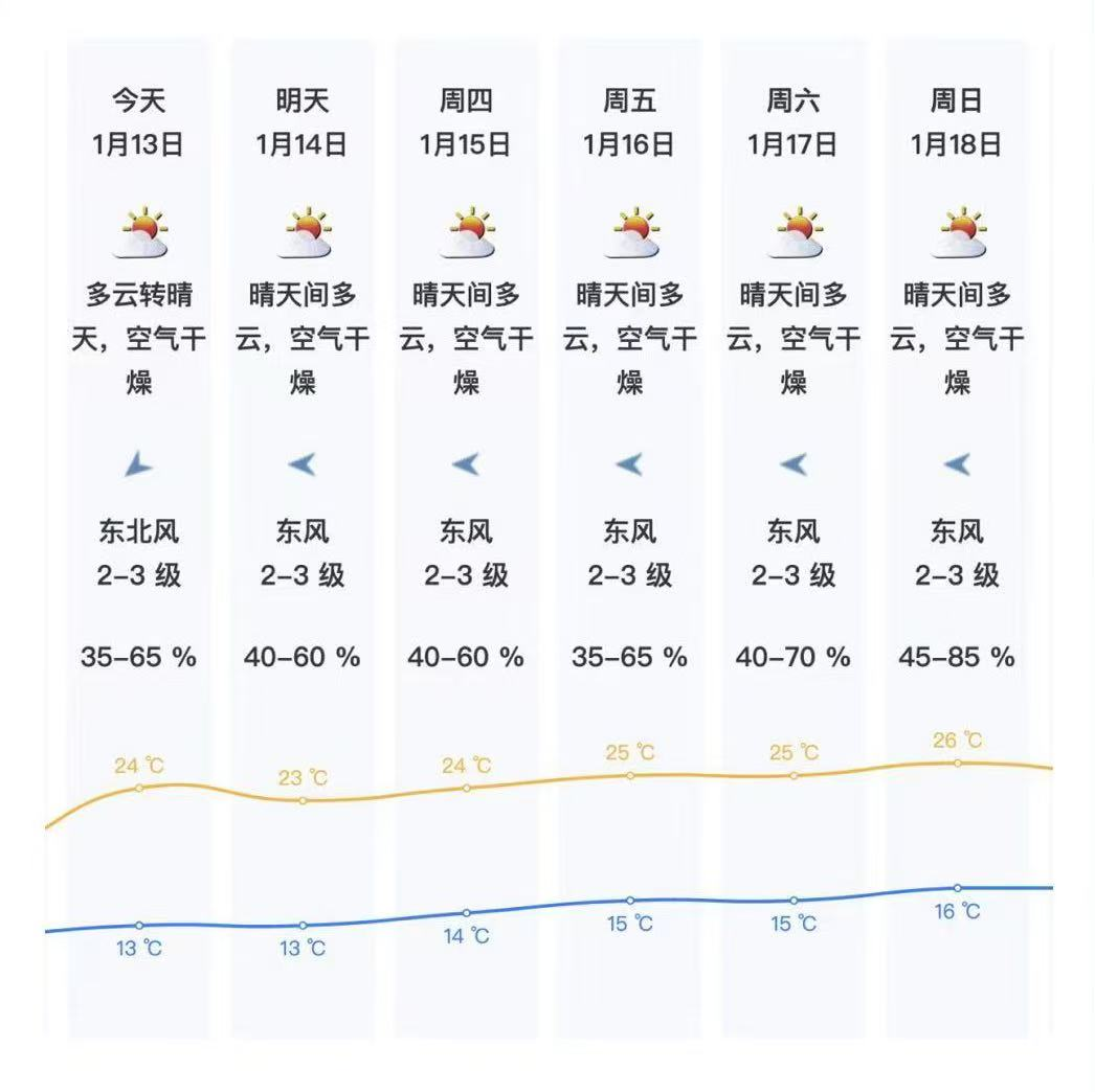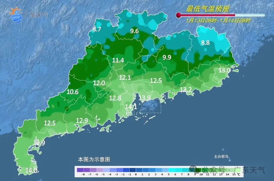 未来五天(1月14日-18日),全省地区气温稳中有升,冷空气进入离场倒计时,全省将开启持续回暖通道,升温步伐稳步向前,日间暖意愈发明显,粤北清晨寒霜袭人、南部日间暖可穿单衣,冰火两重天体验拉满,沿海局地或有零星小雨,早晚寒凉在线,在这“冰火两重天”下,大家穿衣保暖可得多花点心思!