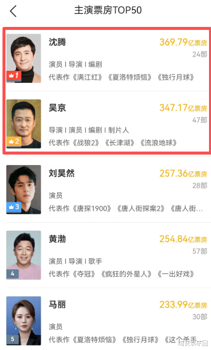 目前主演票房排行榜,沈腾以369亿位列第一,领先吴京22亿有余。