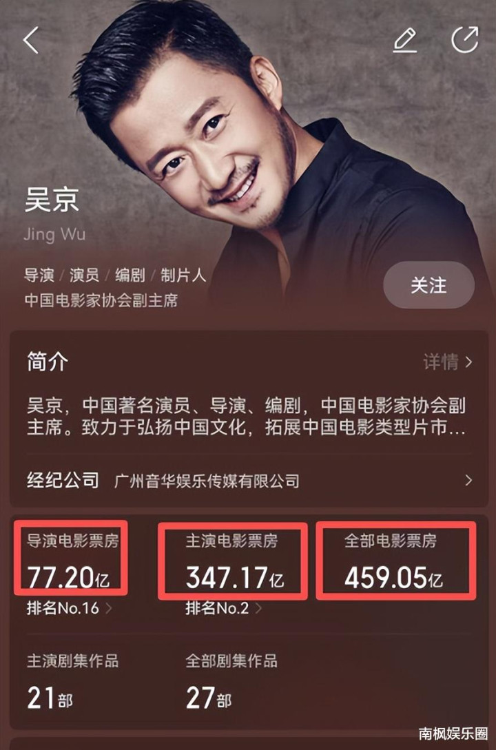 如今吴京的全部电影票房已经有459亿,而主演票房有347亿。